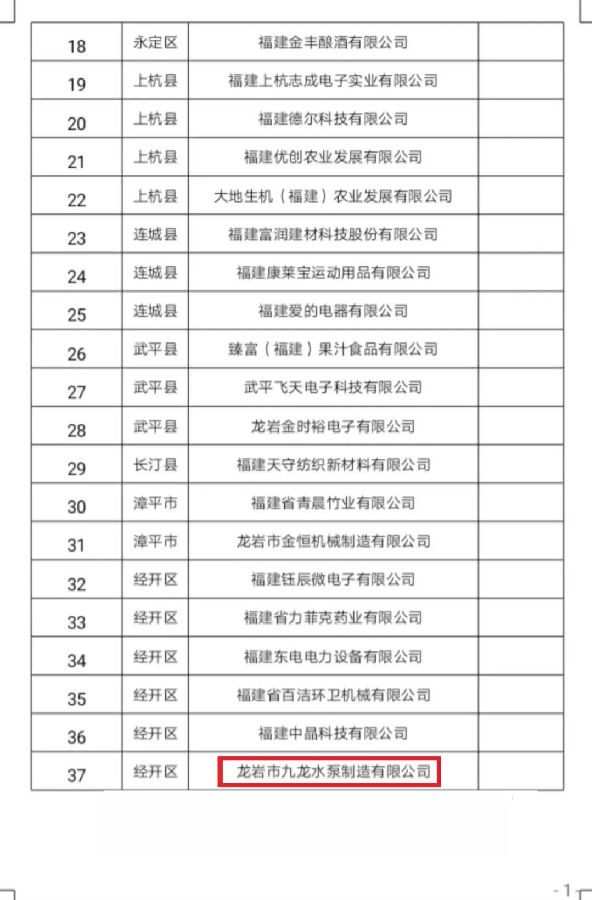 (龍科綜【2018】128號(hào)),經(jīng)各縣(市、區(qū))和龍巖經(jīng)濟(jì)技術(shù)開(kāi)發(fā)區(qū)(高新區(qū))遴選推薦、專家評(píng)審,九龍水泵認(rèn)定為2019年龍巖市科技小巨人領(lǐng)軍企業(yè)。